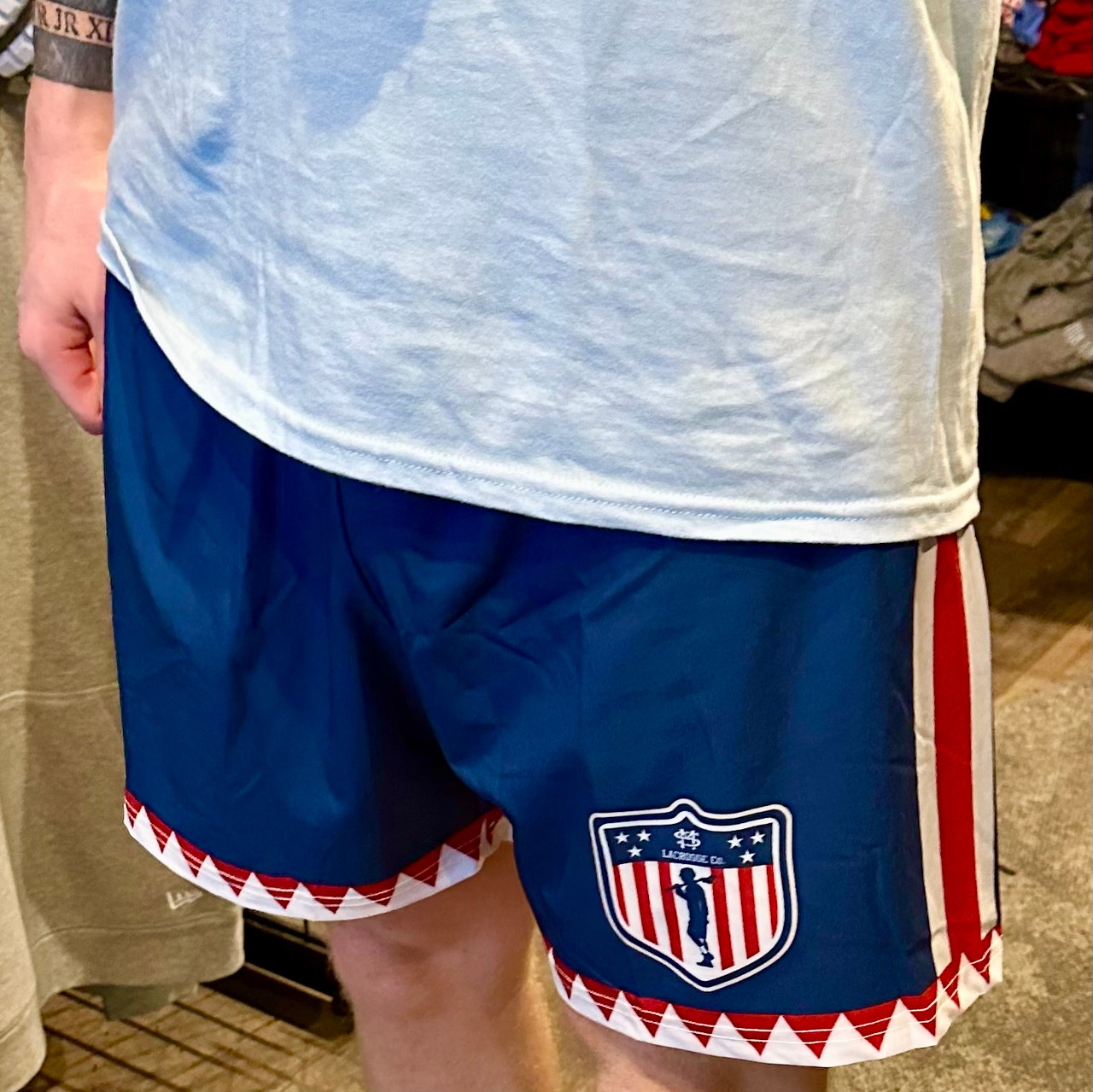 Stinson Mellor Lacrosse Company Red/White/Navy Shorts with the Shield Logo